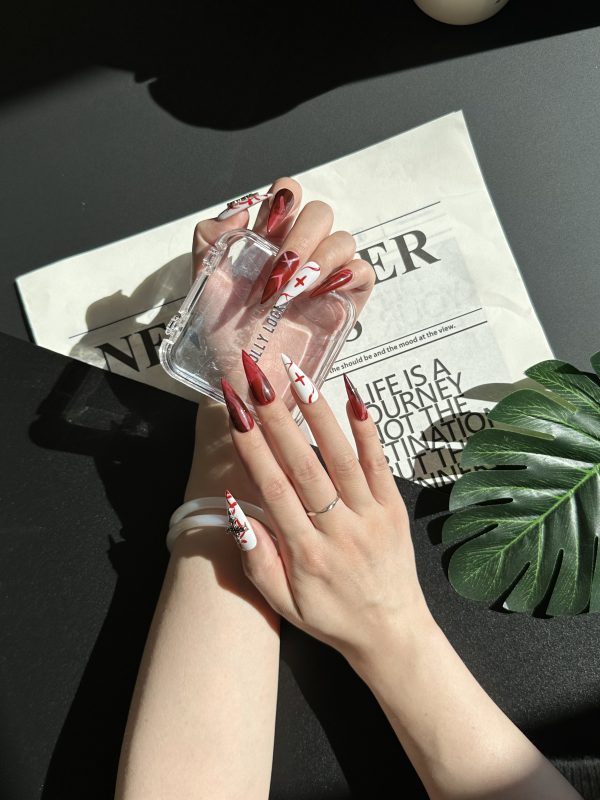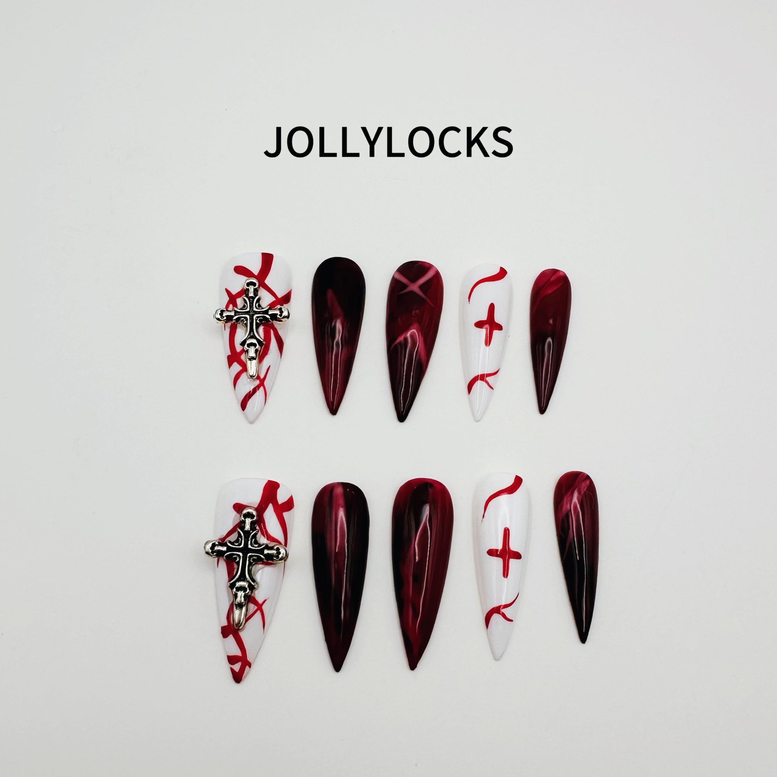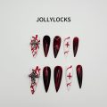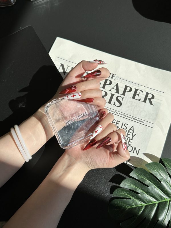Description:A dramatic fusion of deep red and stark white, featuring bold cross embellishments and swirling blood-like details. A fearless statement for those drawn to gothic elegance.