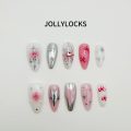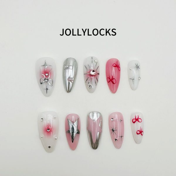 Description: A dazzling mix of metallic silver, soft pink, and intricate bow details, creating a celestial sparkle. Feminine, futuristic, and perfect for making a statement.